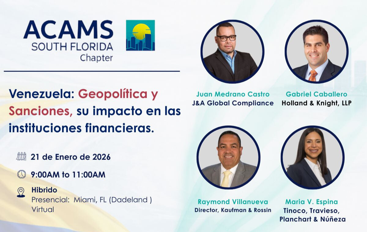 Webinar en español, en el que Juan Medrano, Gabriel Caballero, Raymond Villanueva y María V Espina analizarán el caso Venezuela y su impacto en las instituciones financieras, con especial foco en el cumplimiento de sanciones, riesgos AML y expectativas regulatorias.