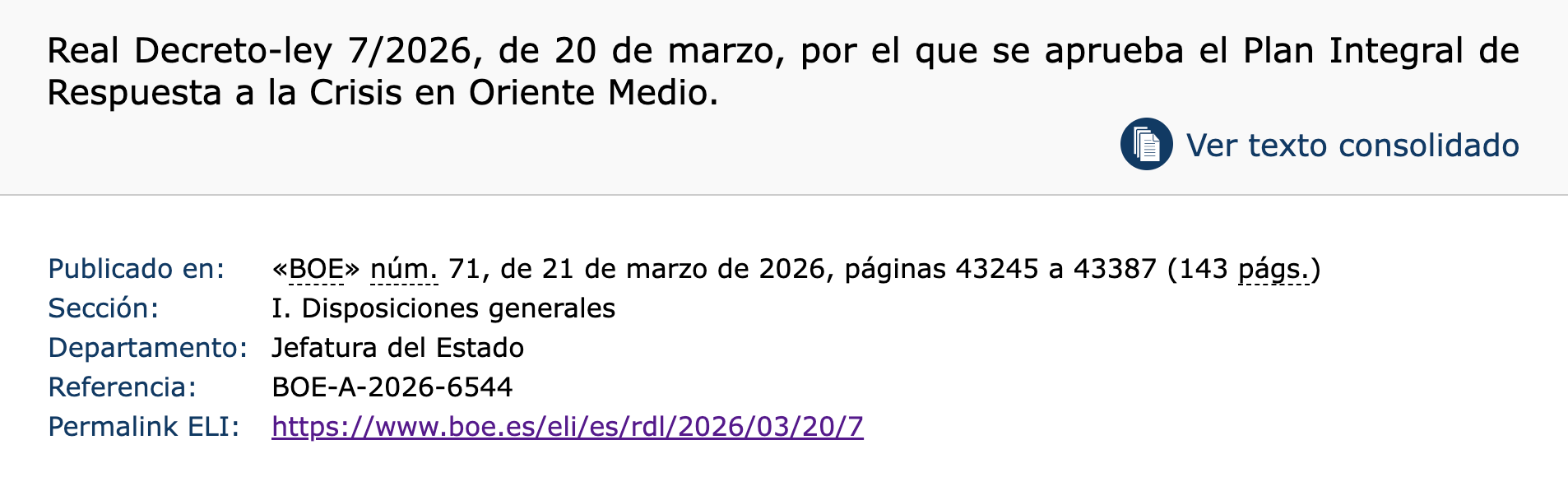 Se publica Real Decreto-ley 7/2026, por el que se aprueba el Plan Integral de Respuesta a la Crisis en Oriente Medio. Con novedades en la aplicación de sanciones internacionales.