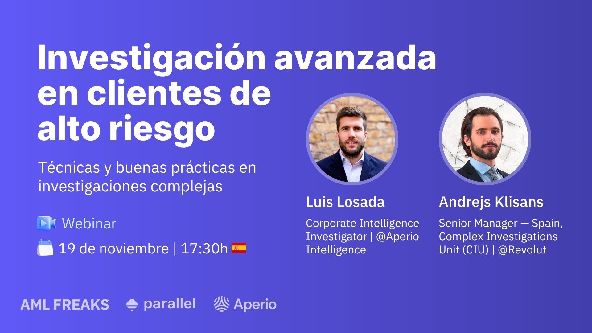 Para este webinar, tenemos la fortuna de contar con Luis Losada (Aperio Intelligence) y Andrejs Klisans (Revolut), quienes compartirán toda su experiencia a partir de casos reales: