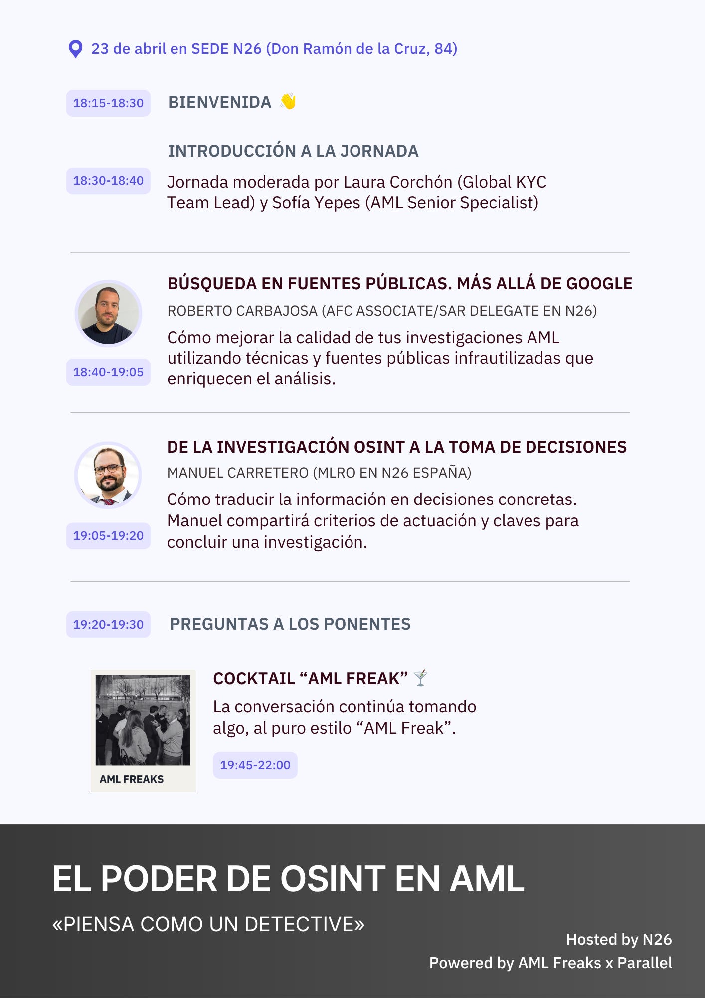 Para vivirlo, contamos con las experiencias de Roberto Carbajosa (AFC Associate/SAR Delegate en N26) y Manuel Carretero (MLRO en N26 España), que compartirán todo lo que saben y más desde una perspectiva práctica.