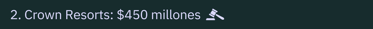 Crown Resorts (sector casinos) recibió una multa de $450 millones en 2023 por infracciones muy graves en su programa de AML/CTF. Se identificaron debilidades en las evaluaciones de riesgos, la due diligence del cliente y en el sistema de monitoreo de transacciones.